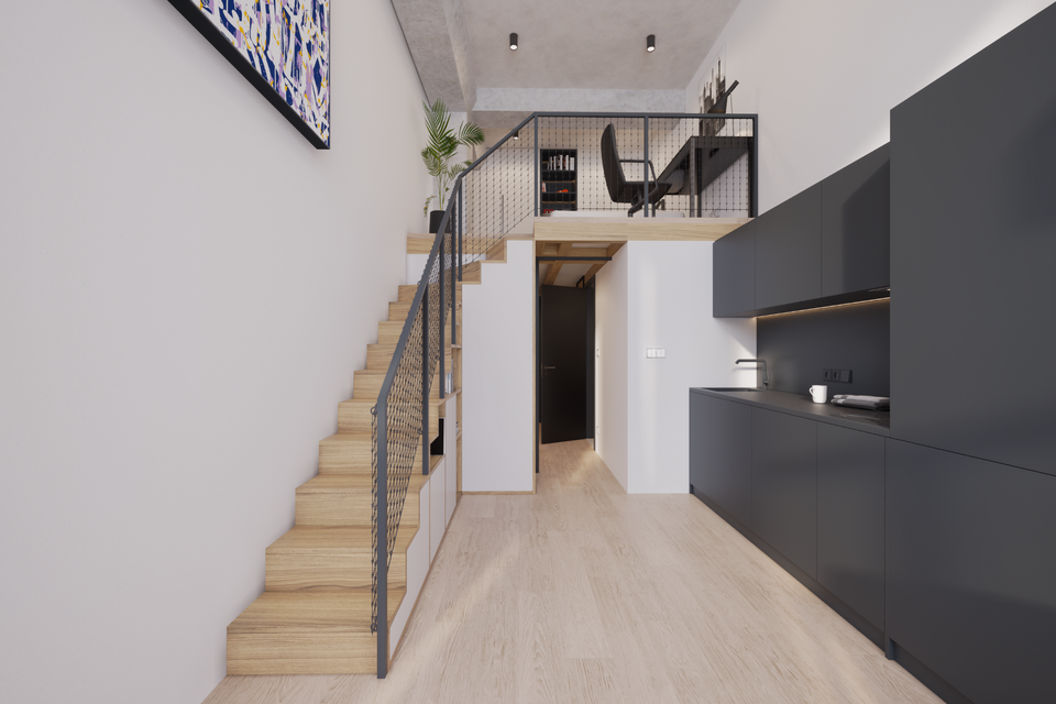 Loftové jednotky: Výměry a rozměry jsou pouze orientační. Světlá výška se může lišit v různých částech jednotky, zejména pod nosnými konstrukčními prvky, jako jsou například nosníky na galerii jednotky.